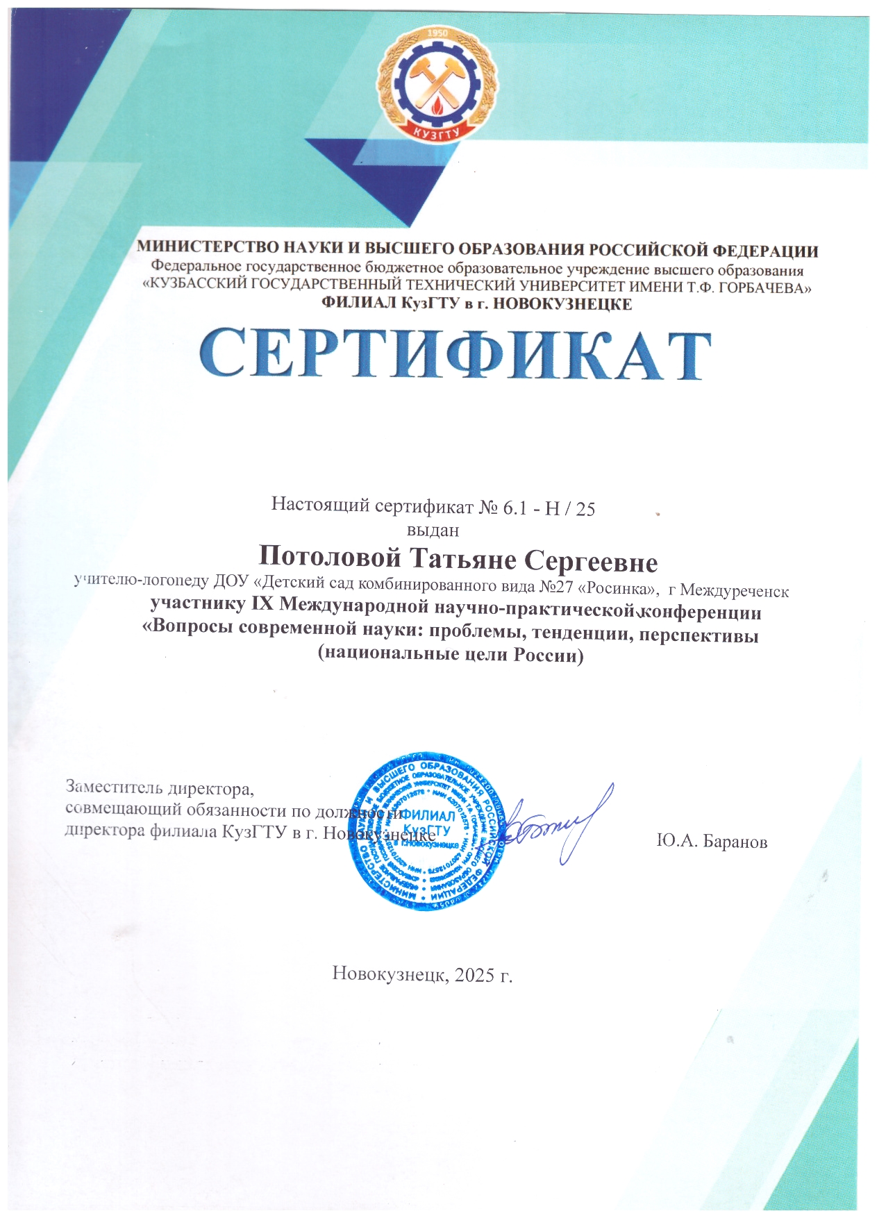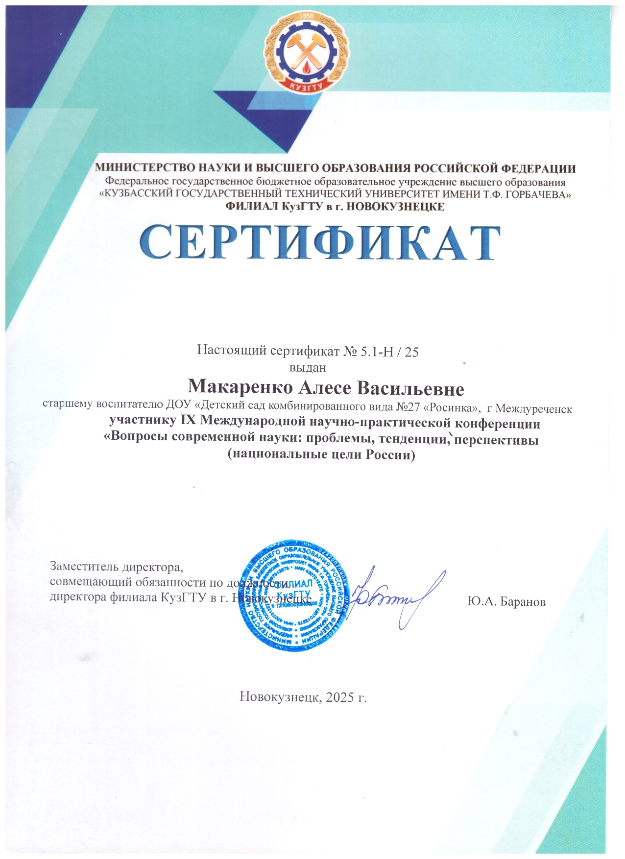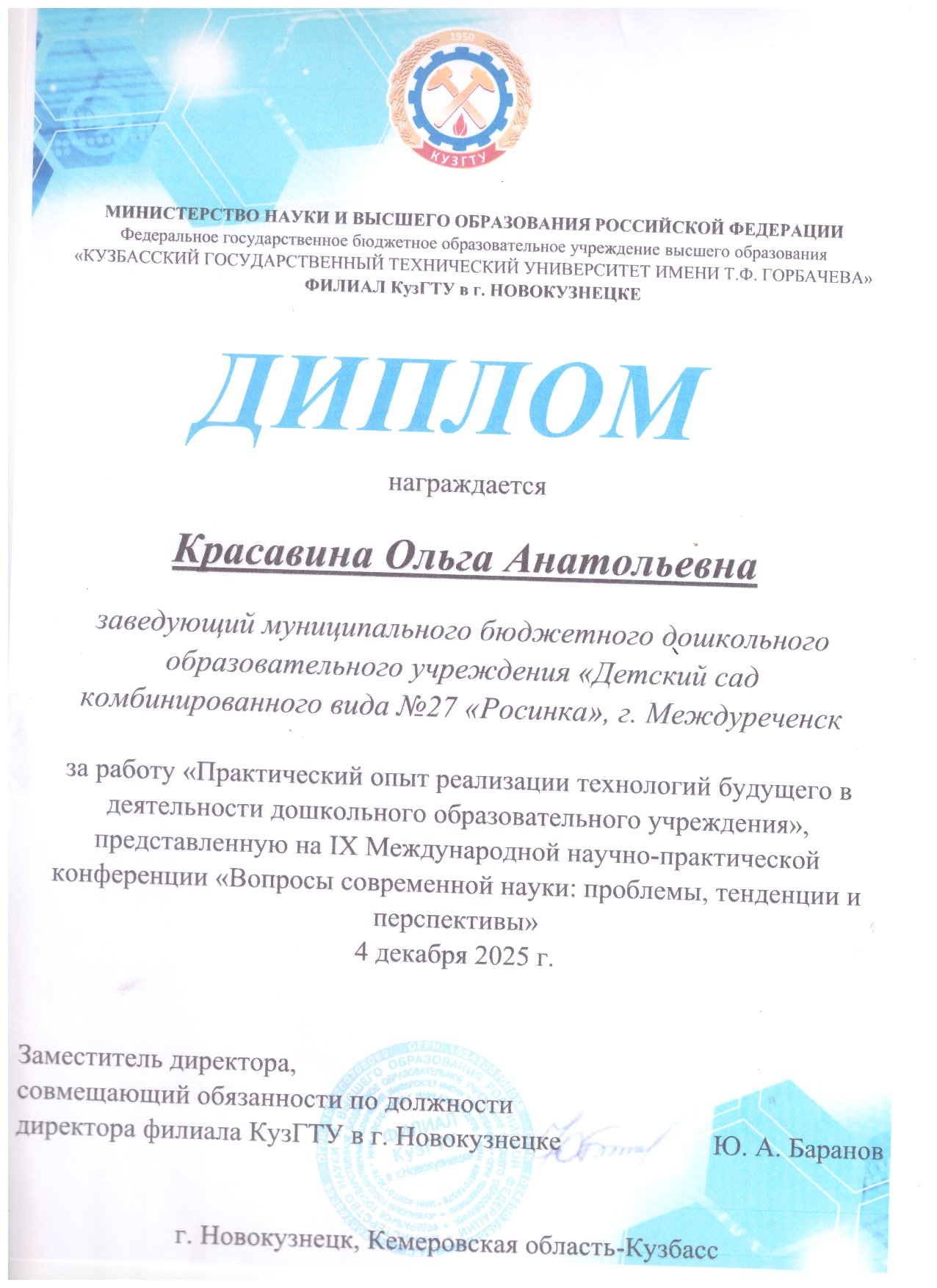 4 декабря 2025 года в в "КГТУ имени Т.Ф.Горбачева" филиал КузГТУ города Новокузнецка состоялась Международная научно-практическая конференция, посвящённая актуальным проблемам сохранения населения, укрепления здоровья и повышения уровня благосостояния Россиян, поддержки семей и формирования социально ответственных личностей. МБДОУ «Детский сад № 27 «Росинка» представил интересный доклад в рамках первой секции конференции, поделившись ценным опытом работы с детьми дошкольного возраста. В презентации приняли участие заведующий Красавина Ольга Анатольевна, старший воспитатель Макаренко Алеся Васильевна и учитель-логопед Потолова Татьяна Сергеевна. Доклад был посвящен уникальной тематике «Практический опыт реализации технологий будущего в деятельности дошкольного образовательного учреждения». В ходе выступления были представлены два направления образовательной деятельности детского сада № 27 «Росинка» : Физическое развитие: педагоги продемонстрировали успешный опыт организации занятий на современном спортивном оборудовании — уникальном скалодроме, который активно используется для физического воспитания малышей и стимулирует интерес к активному образу жизни. Речевое развитие: значительное внимание уделялось новым методикам коррекции речи, применяемым нашим учителем-логопедом. Эти методики позволяют эффективно развивать речь ребёнка, устранять дефекты произношения и способствуют успешной социализации воспитанников. Представленный опыт получил высокую оценку участников форума, вызвал живой отклик среди коллег из разных регионов России и показал важность интеграции современных подходов в работу детских садов для всестороннего развития подрастающего поколения.